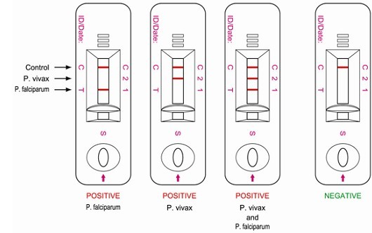 三條測試線都出現(xiàn),表明惡性瘧原蟲和間日瘧原蟲都為陽性。
