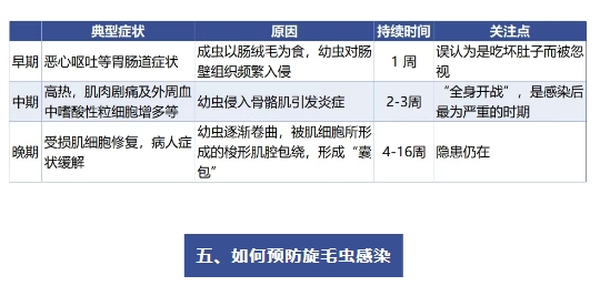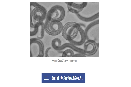 成蟲期:成蟲會在人體的小腸中停留幾周甚至幾個月來“產(chǎn)子”(卵胎生)。產(chǎn)出的幼蟲“寶寶”穿透腸壁,隨著血液和淋巴系統(tǒng)擴散到全身肌肉中,形成“囊包”。